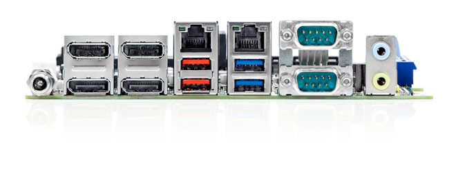 LAN/USB/COM 2x RJ45, 4x USB 3.1 Gen1 (2x optional), 2x USB 3.1 Gen2, 2x USB 2.0 (opt.), 4x COM (2x opt.)